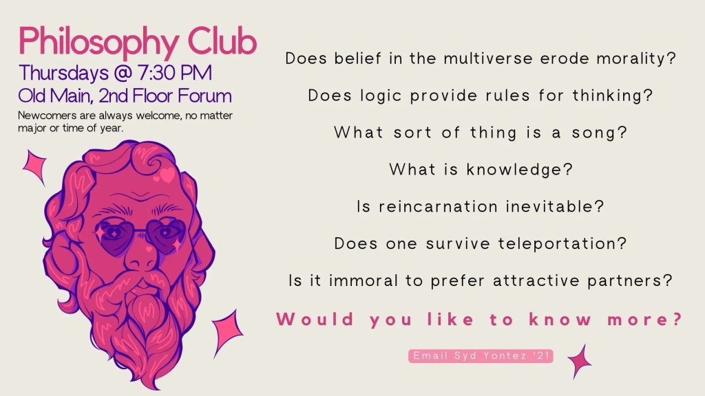 - Thursday evenings, 7:30pm – 8:30pm in the Philosophy Forum (Old Main, second floor)